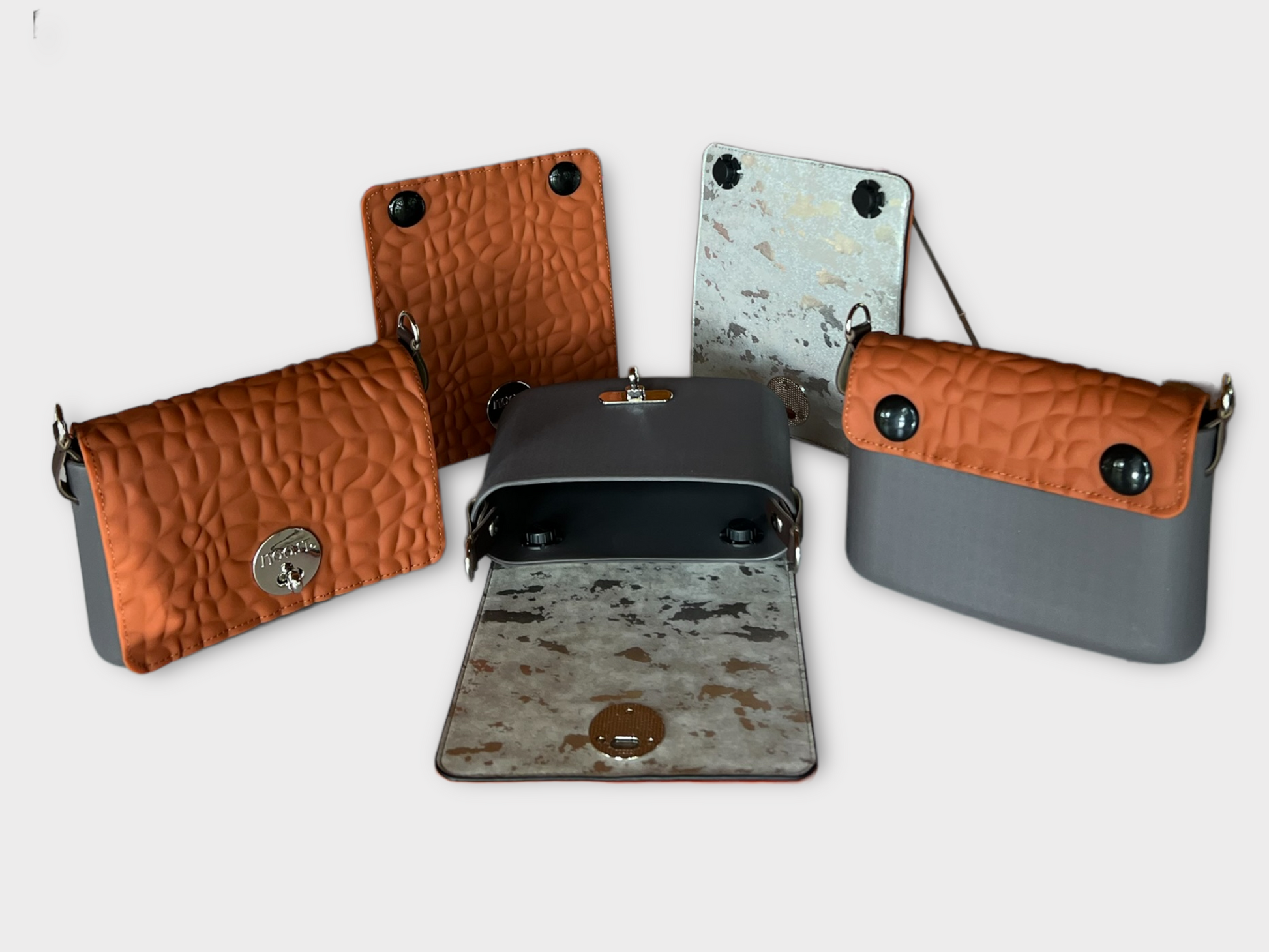 The 'Flap' of the crossbody is an eye-catching, padded, eco-friendly silicone body sewn to a silver foiled lining crafted by a 3D mold. The unique, raised, baby-soft pattern feels luxurious to the touch and soothing to the eye. The peek-a-boo silver foiled lining is unexpected and glamourous.