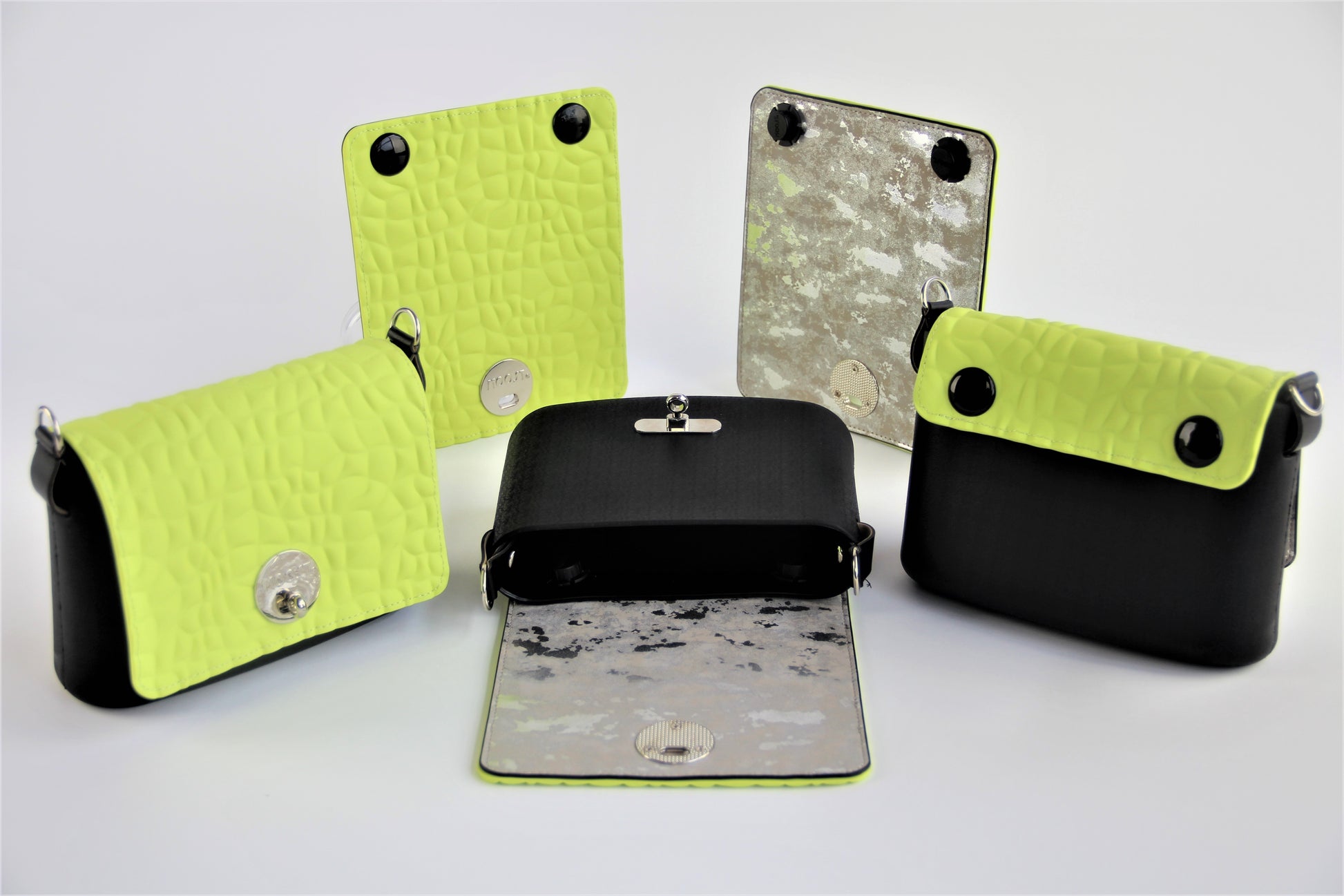 The 'Flap' of the crossbody is an eye-catching, padded, eco-friendly silicone body sewn to a silver foiled lining crafted by a 3D mold. The unique, raised, baby-soft pattern feels luxurious to the touch and soothing to the eye. The peek-a-boo silver foiled lining is unexpected and glamourous.