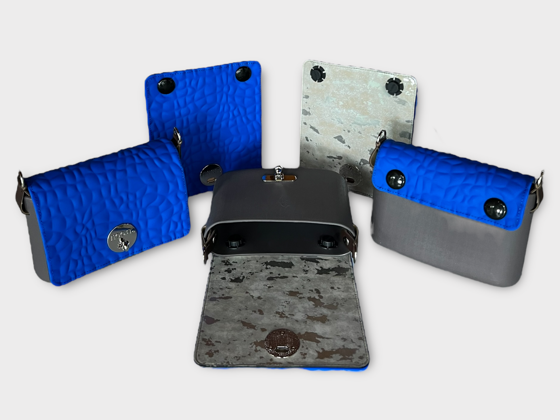 The 'Flap' of the crossbody is an eye-catching, padded, eco-friendly silicone body sewn to a silver foiled lining crafted by a 3D mold. The unique, raised, baby-soft pattern feels luxurious to the touch and soothing to the eye. The peek-a-boo silver foiled lining is unexpected and glamourous.