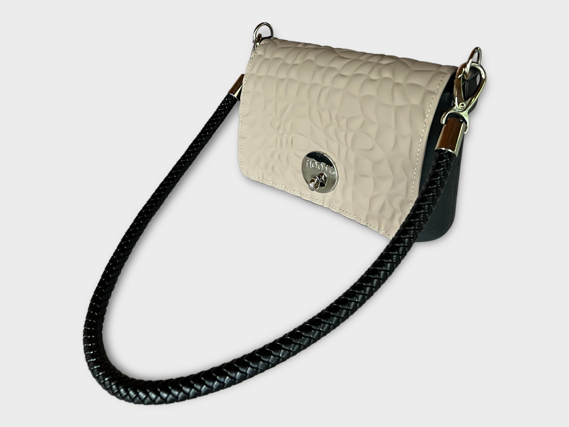 Soft and Sturdy, the Interwoven, Cross Hatch style of this tubular Handle is everything you want it to be. The sturdy silver clasping hardware connects into a unique elongated soft faux leather connector pieces which includes our famous interlocking screw system.