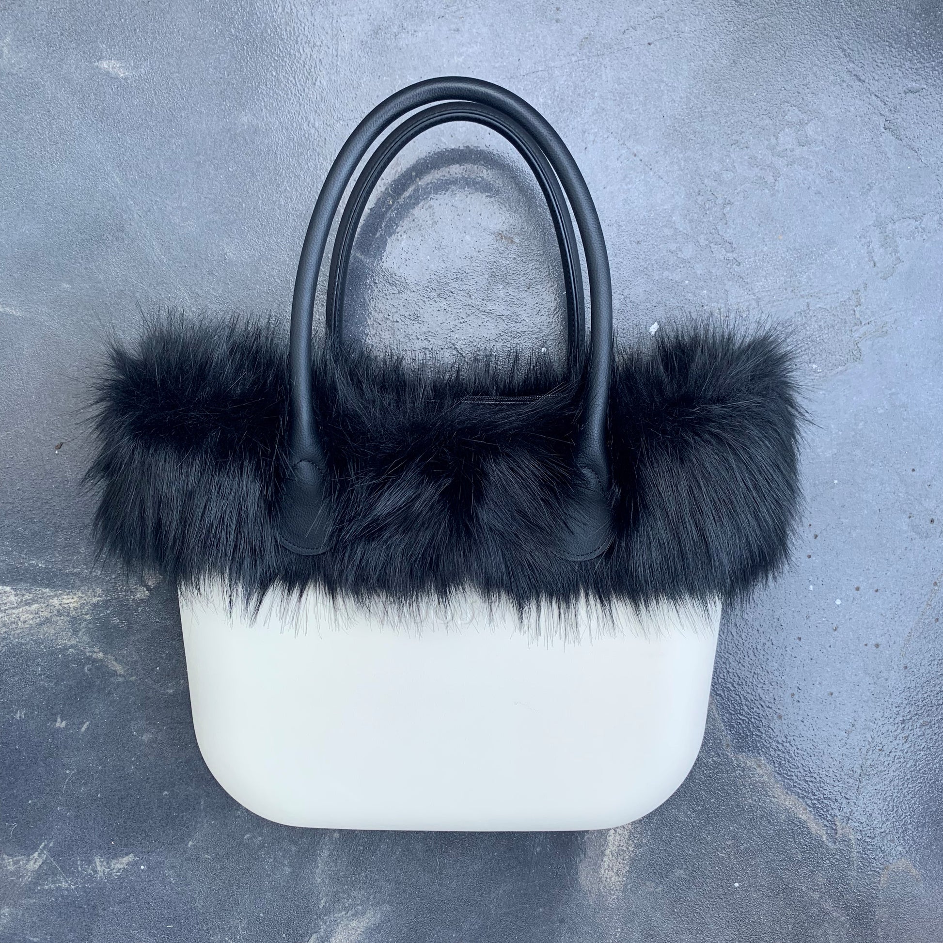 The Showstopper features an Almond Shell Shell, Black Inner Bag and Matte Black Rolled Handles, & Ebony Faux Fox Fur Trim.