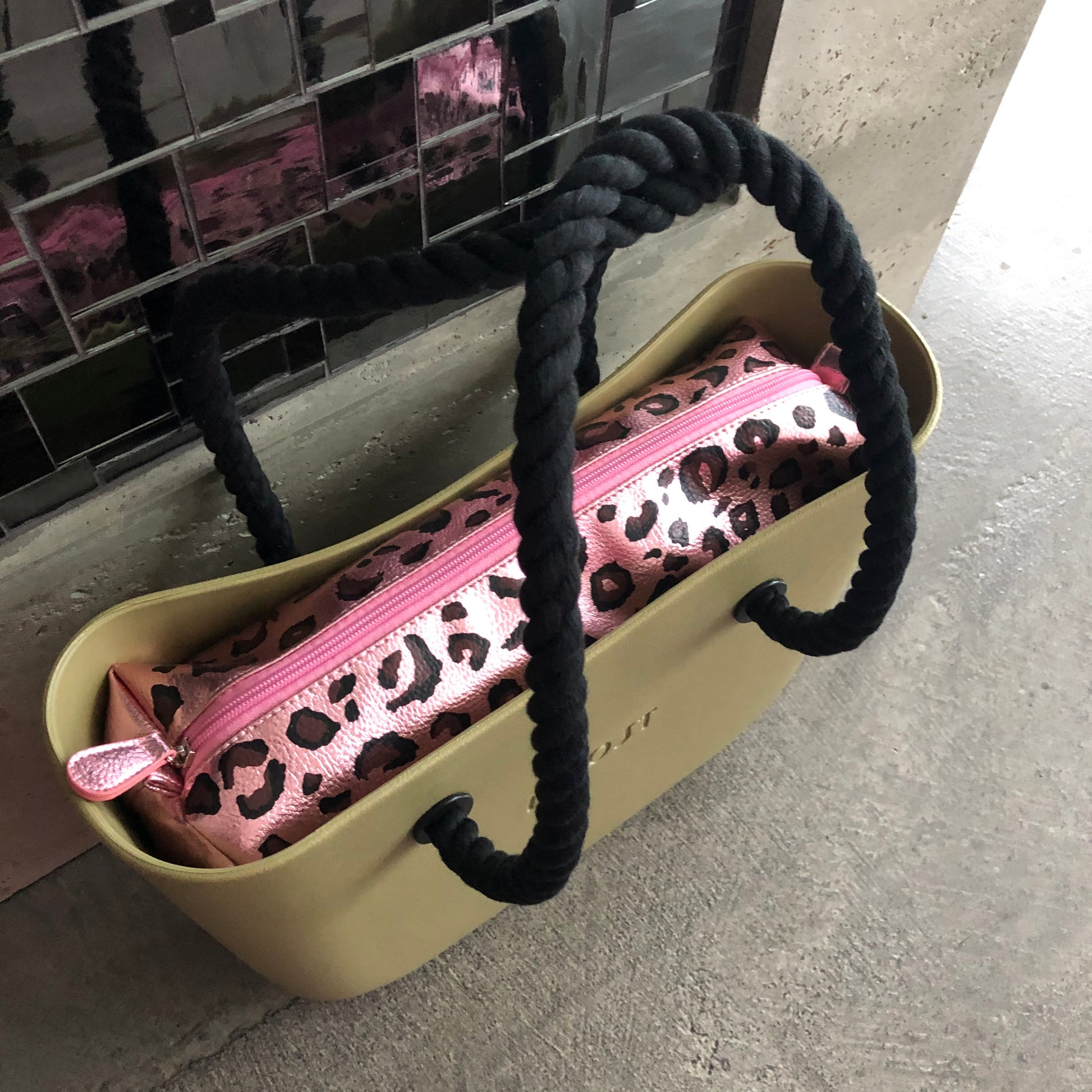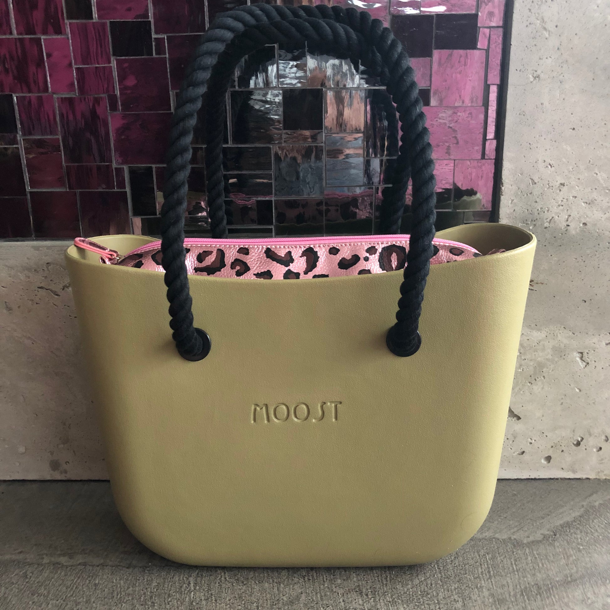 The Cheetah Woman Inner Bag has been hand painted and sealed using Angelus leather paint products. It still remain durable and water resistant. This fully lined inner bag features a full zip top closure and includes one inner zip pocket. Simply place the Inner Bag into the shell and attach your choice of handle. This connects the inner bag to the shell and completely closes your Moost Bag.
