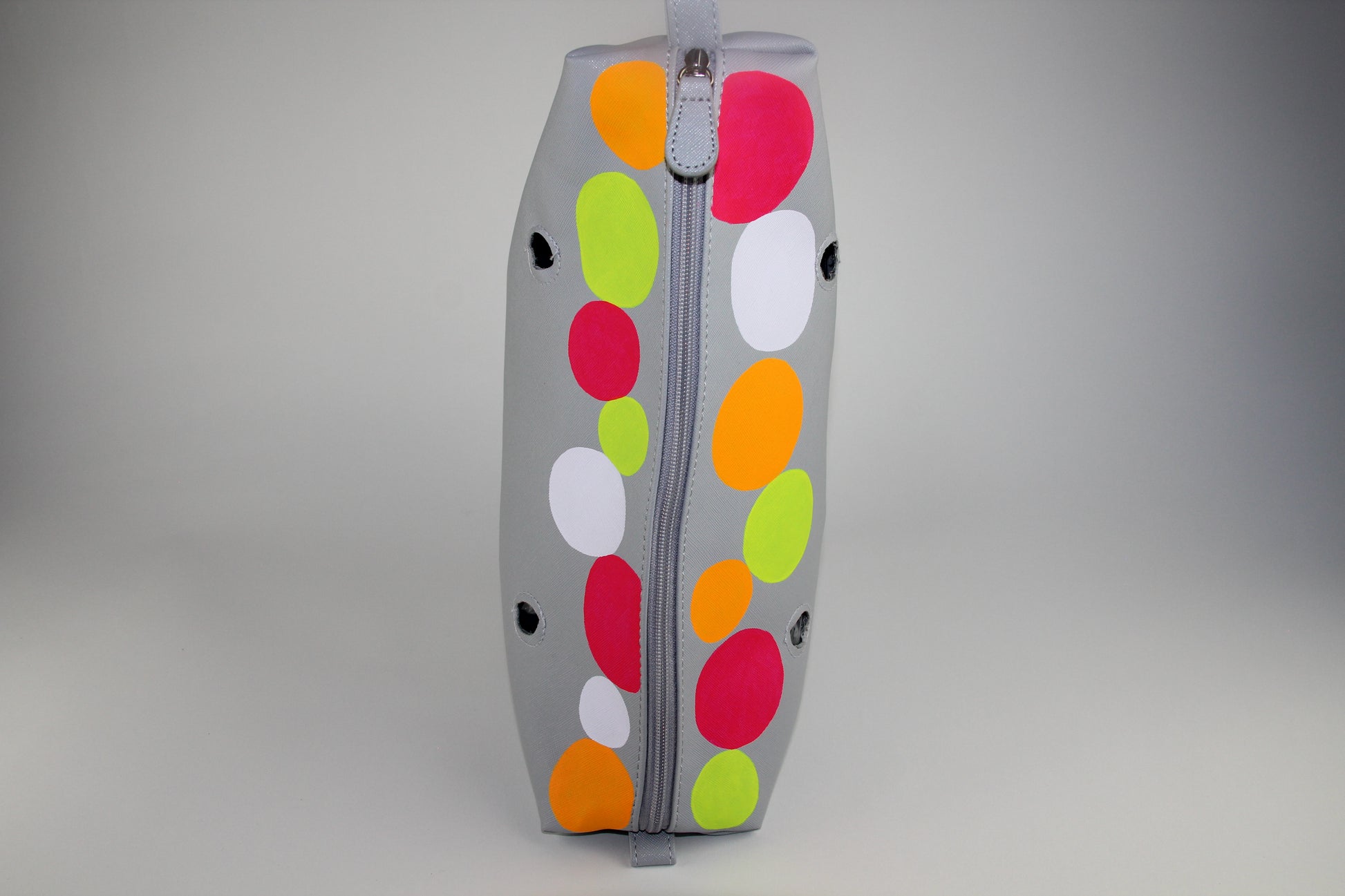 The Circle Capsule Inner Bags have been hand painted and sealed using Angelus leather paint products. They still remain durable and water resistant. This fully lined inner bag features a full zip top closure and includes one inner zip pocket. Simply place the Inner Bag into the shell and attach your choice of handle. This connects the inner bag to the shell and completely closes your Moost Bag.