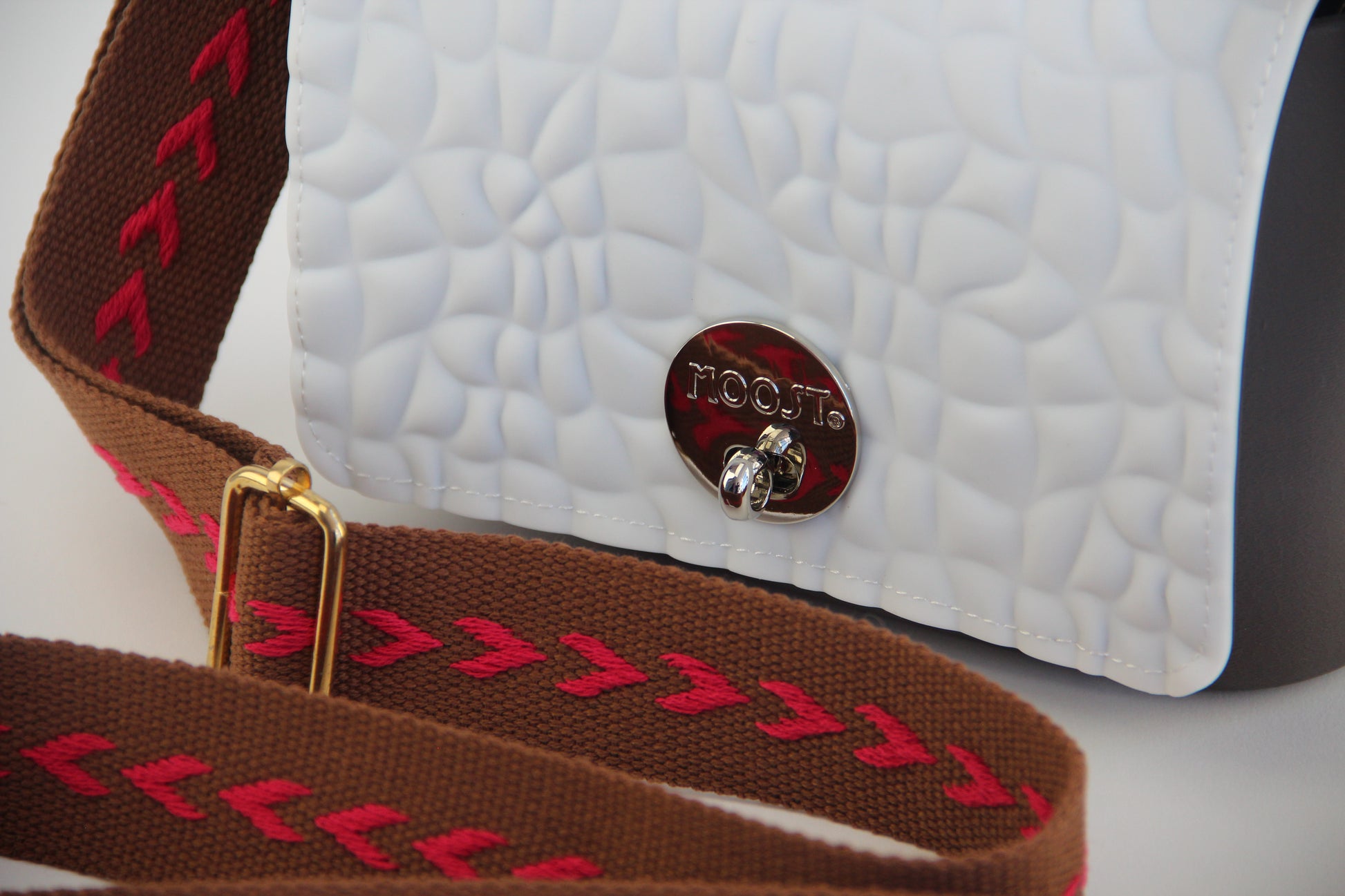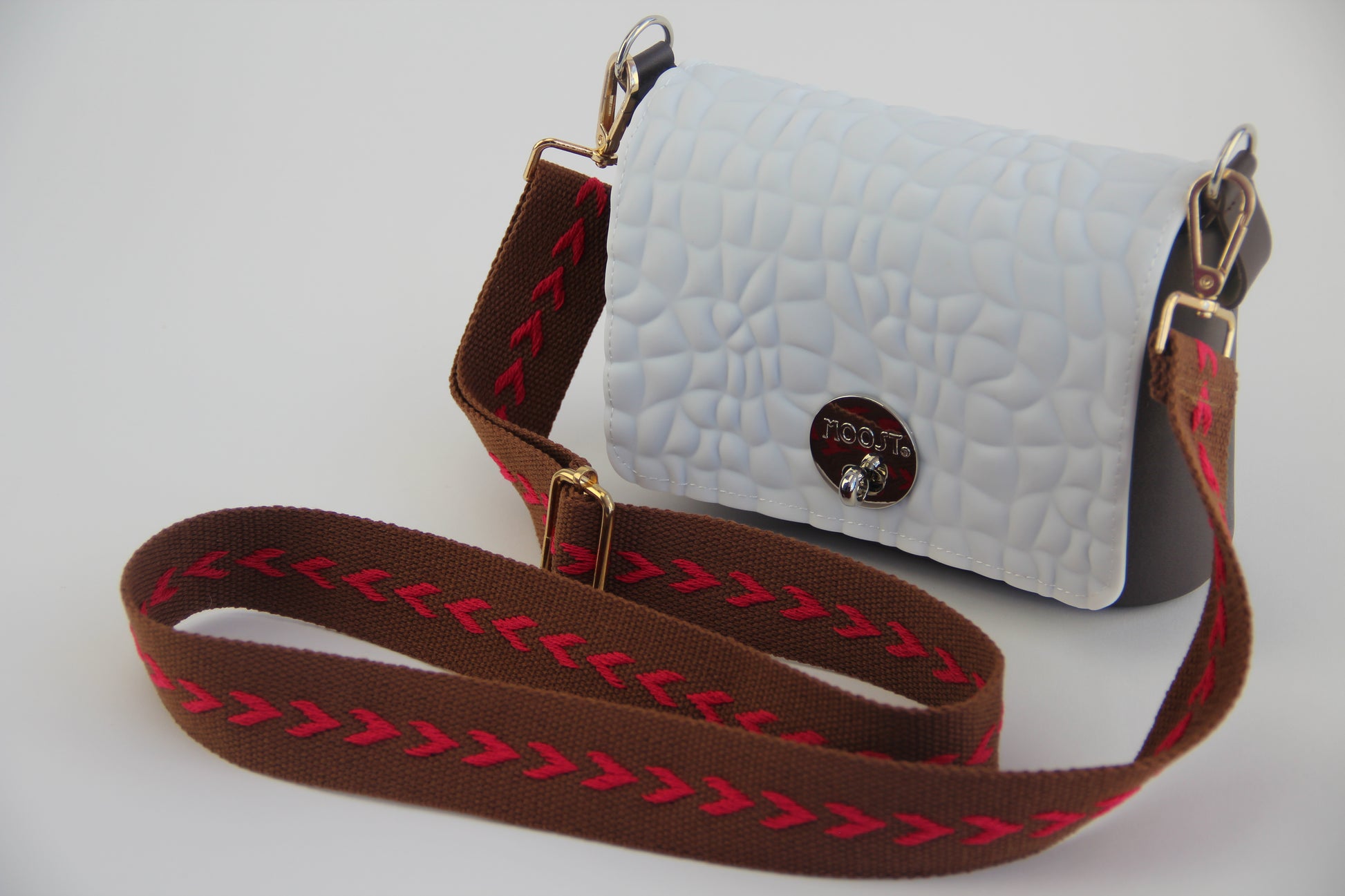 A Saddle Brown cotton canvas, adjustable strap with a fuchsia woven Boho feather detail on both sides. Finished off with a gold alloy clip.