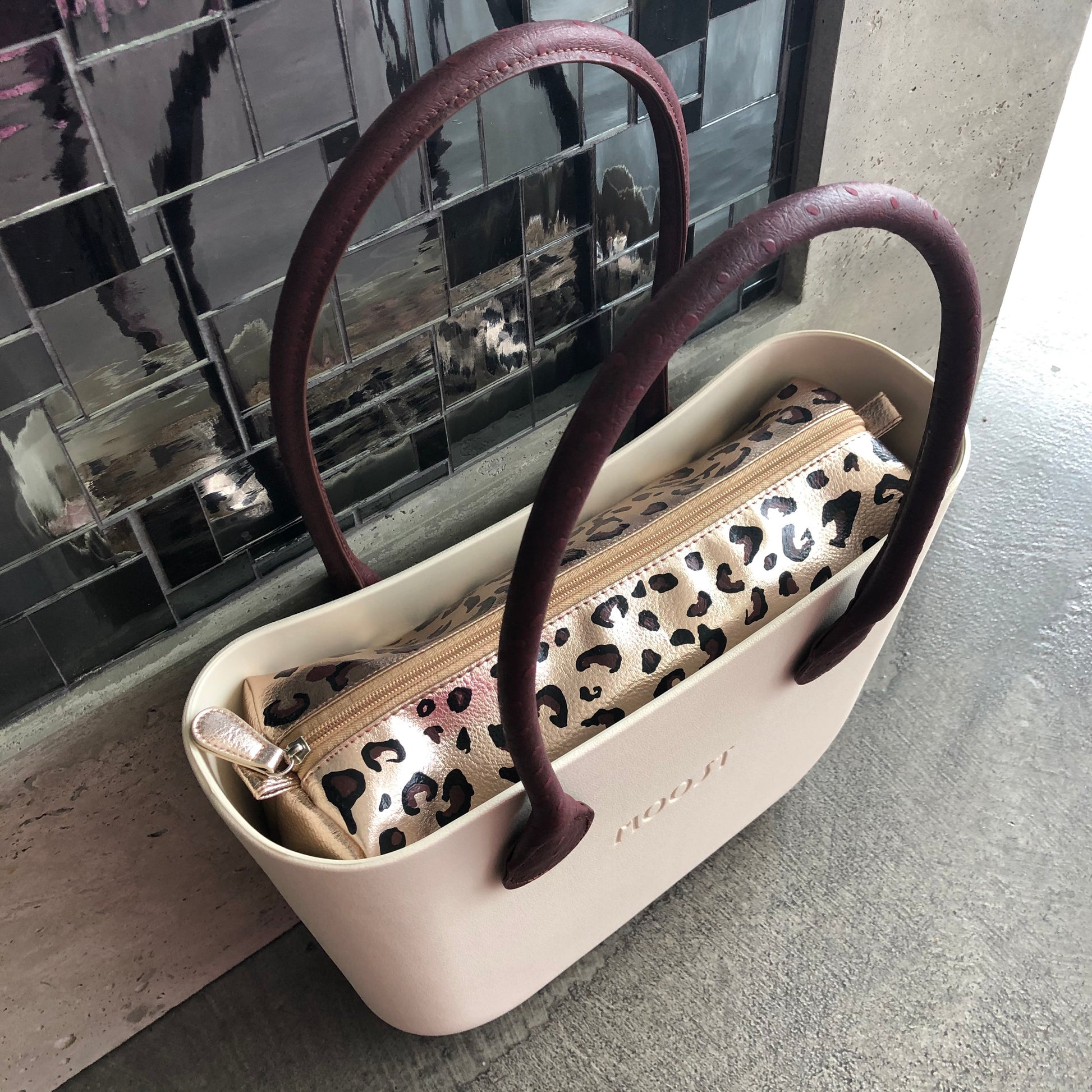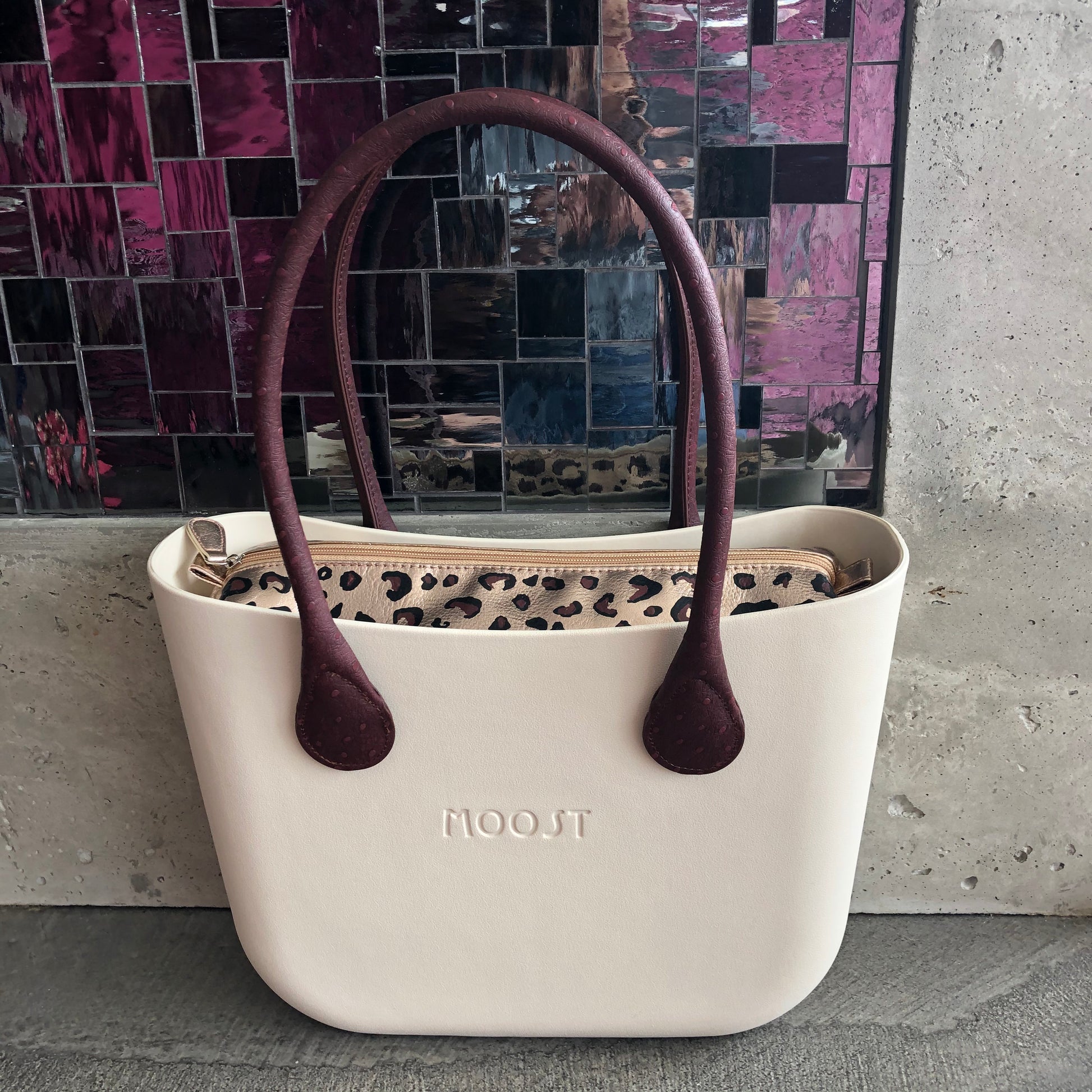 The True Leopard Inner Bag has been hand painted and sealed using Angelus leather paint products. It still remains durable and water resistant. This fully lined inner bag features a full zip top closure and includes one inner zip pocket. Simply place the Inner Bag into the shell and attach your choice of handle. This connects the inner bag to the shell and completely closes your Moost Bag.