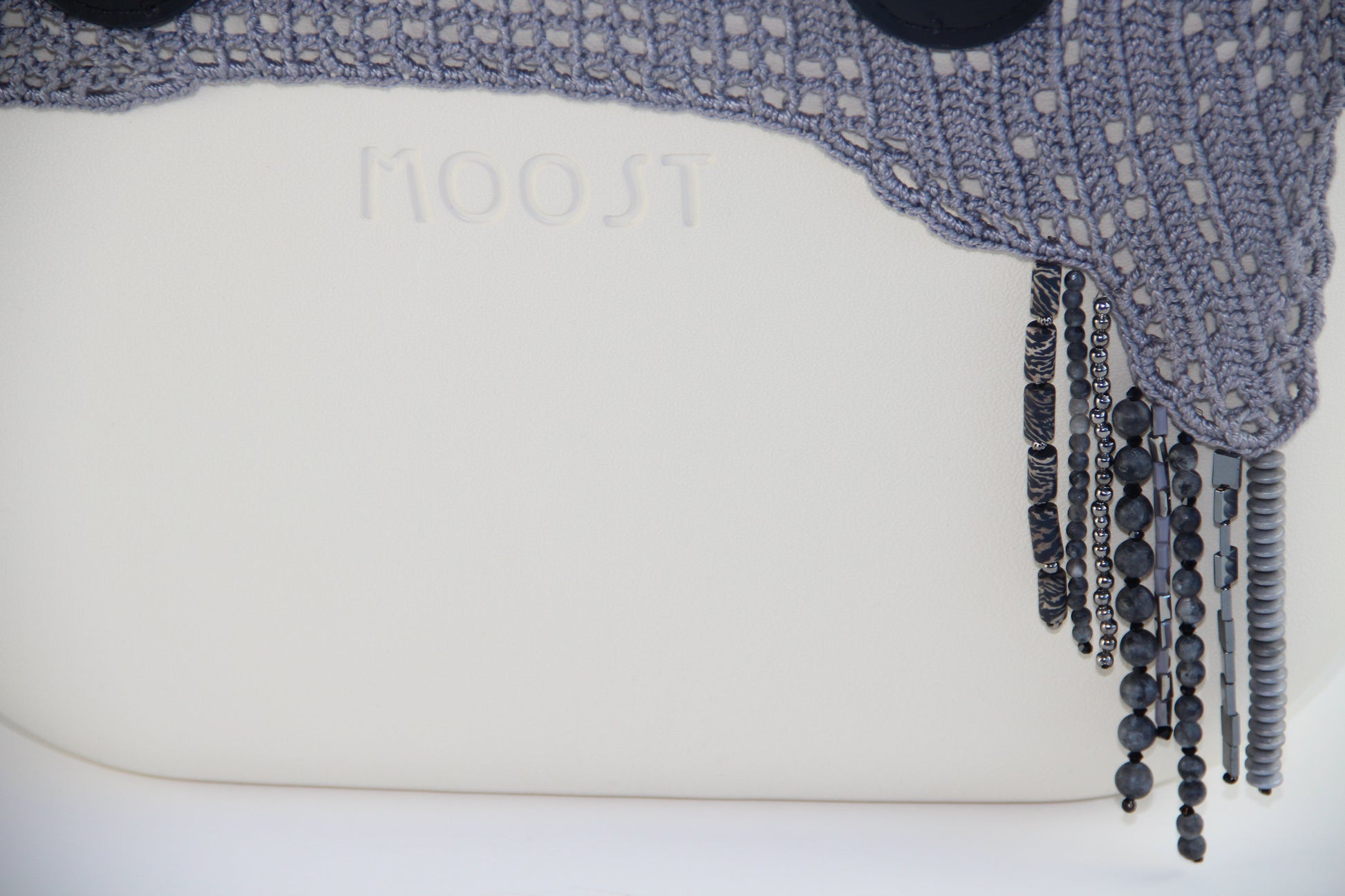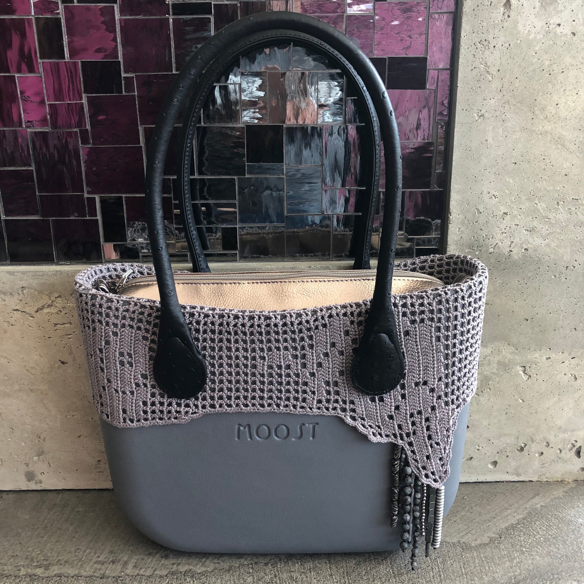 It's one of our favorite colors. Gray. And Mooms found all the beautiful Shades of Gray (no pun intended!) Beads for this Tat Trim. Pairs beautifully with all Gray Moost Bag interchangeable pieces.